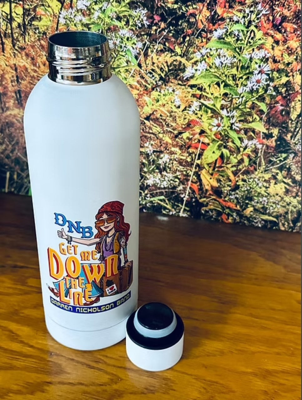 Stay hydrated out at festivals and on the go! This white aluminum bottle is decorated with a design that honors the free spirit of our song "Get Me Down the Line" - as created by our friend Jonathan Carroll!